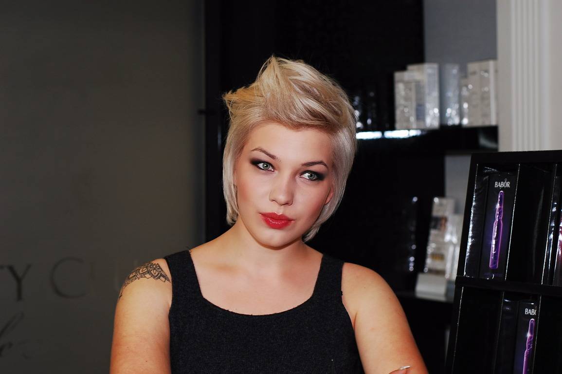 Я предложил осветлить волосы ещё сильнее для того, чтобы сделать цвет более контрастным и ярким, с холодным оттенком, и, оказалось, что Аня давно хотела так покрасить волосы, но не решалась на это по причине здоровья волос, но с инновационными средствами теперь возможно все. Затем мы сделали контрастную стрижку с удлиненной верхней и нижней зоной, плоскими височными зонами, что даёт возможность для разнообразного моделирования, а макияж - тоже достаточно яркий, поскольку работа проходит в вечернее время и предполагает хорошее настроение. И вот наш образ в стиле глэм рок, который отлично подходит представительнице индустрии развлечений.