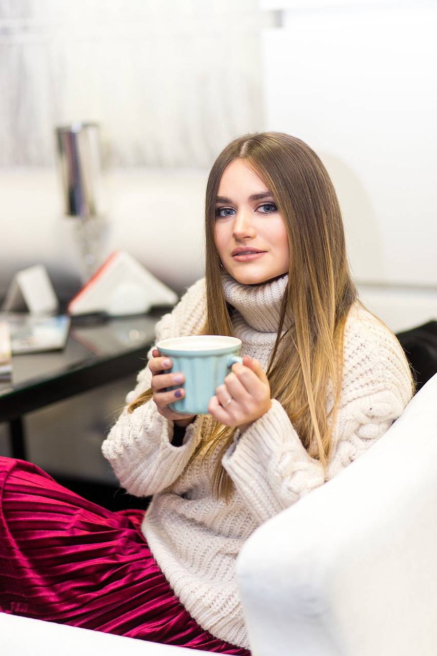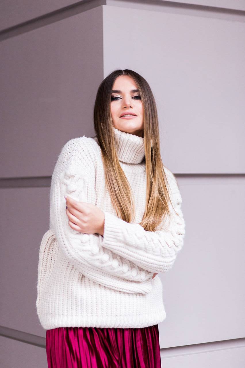 А длинные волосы помогли создать силовую линию по вертикали, что хорошо подчеркивает стройность молодой девушки.